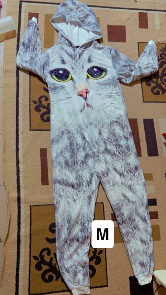 Pyjama femme motif chat, taille M. Originalité avec capuche imprimée. Style fun et confortable.