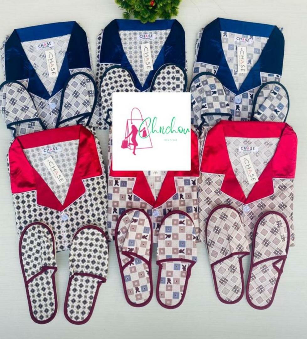 Découvrez notre ensemble pyjama en satin élégant, parfait pour des nuits confortables. Avec ses motifs raffinés et son toucher doux, c’est le choix idéal pour un luxe nocturne. Inclut des pantoufles assorties pour un confort complet à la maison.