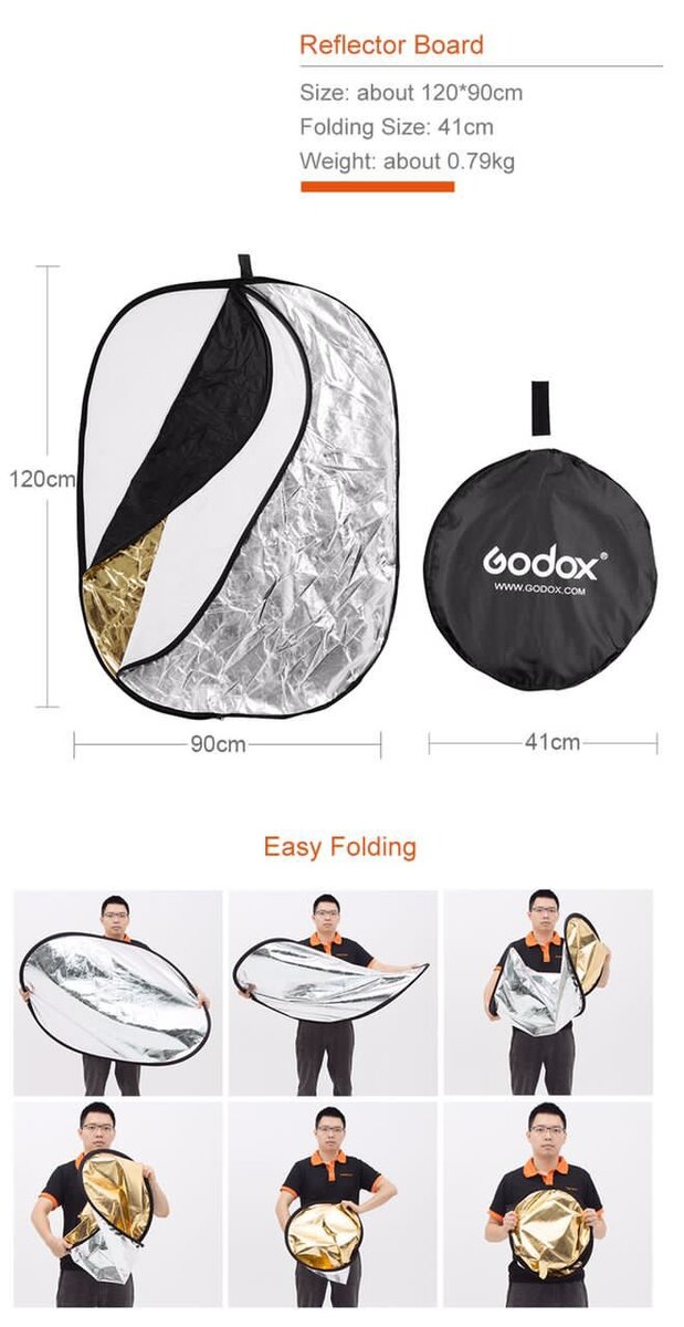 Réflecteur photo pliant Godox, idéal pour la photographie en intérieur ou extérieur. Compact et léger avec options argent et or pour divers effets lumineux. Facile à transporter avec sa housse incluse. Parfait pour les photographes professionnels et amateurs.