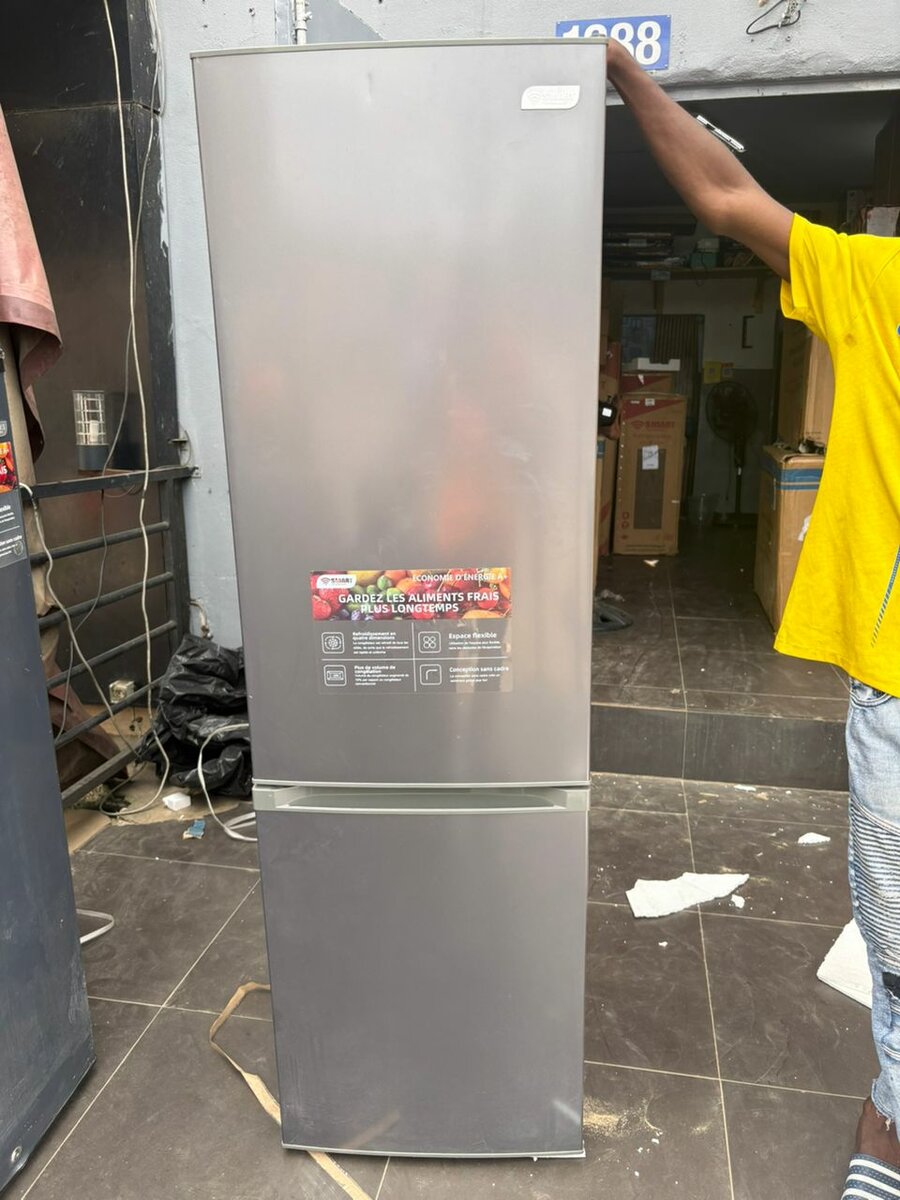 Réfrigérateur compact et élégant avec finition argentée. Idéal pour les petits espaces, il offre un espace de stockage optimal pour vos aliments frais. Facile à utiliser et à entretenir.