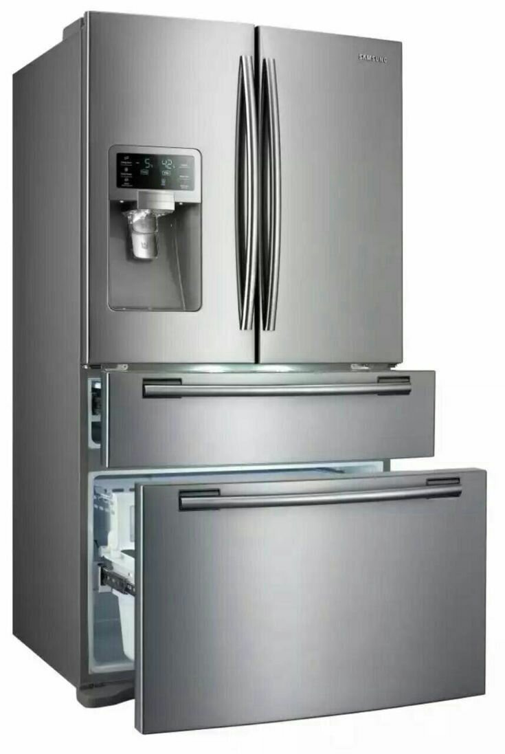 Découvrez le réfrigérateur moderne en acier inoxydable avec congélateur. Doté d'un distributeur d'eau et de glaçons, il offre une capacité spacieuse et une organisation pratique avec ses tiroirs. Idéal pour les familles ou cuisines contemporaines.