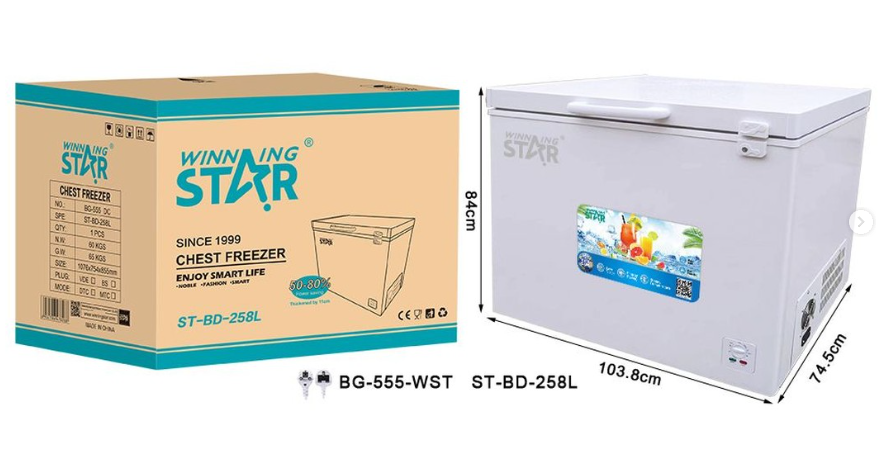 ST-BD-258L Однодверный морозильник с прямым охлаждением и верхним открытием Модель №: ST-BD-258L Размер: 103,8**74,5*84СМ Мощность: 78 Вт Напряжение: 220 В переменного тока/24 В постоянного тока/