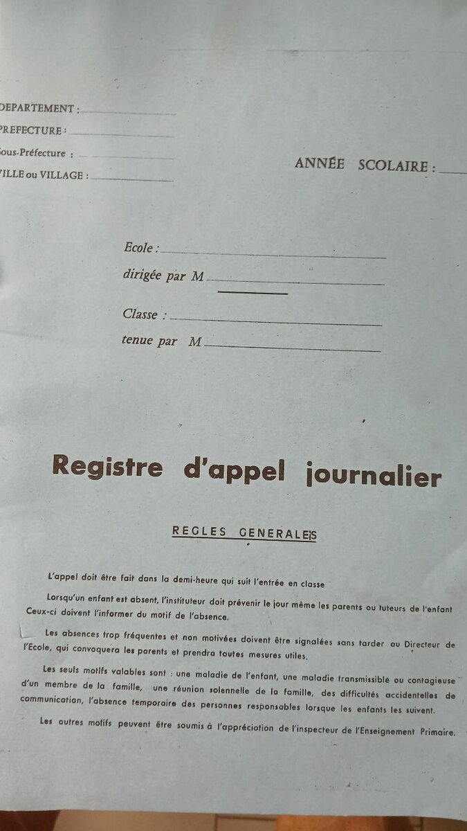 Registre d'appel journalier pour suivre la présence des élèves. Idéal pour instituteurs/trices souhaitant organiser efficacement la gestion des présences. Couverture robuste avec espace pour année scolaire et informations essentielles.