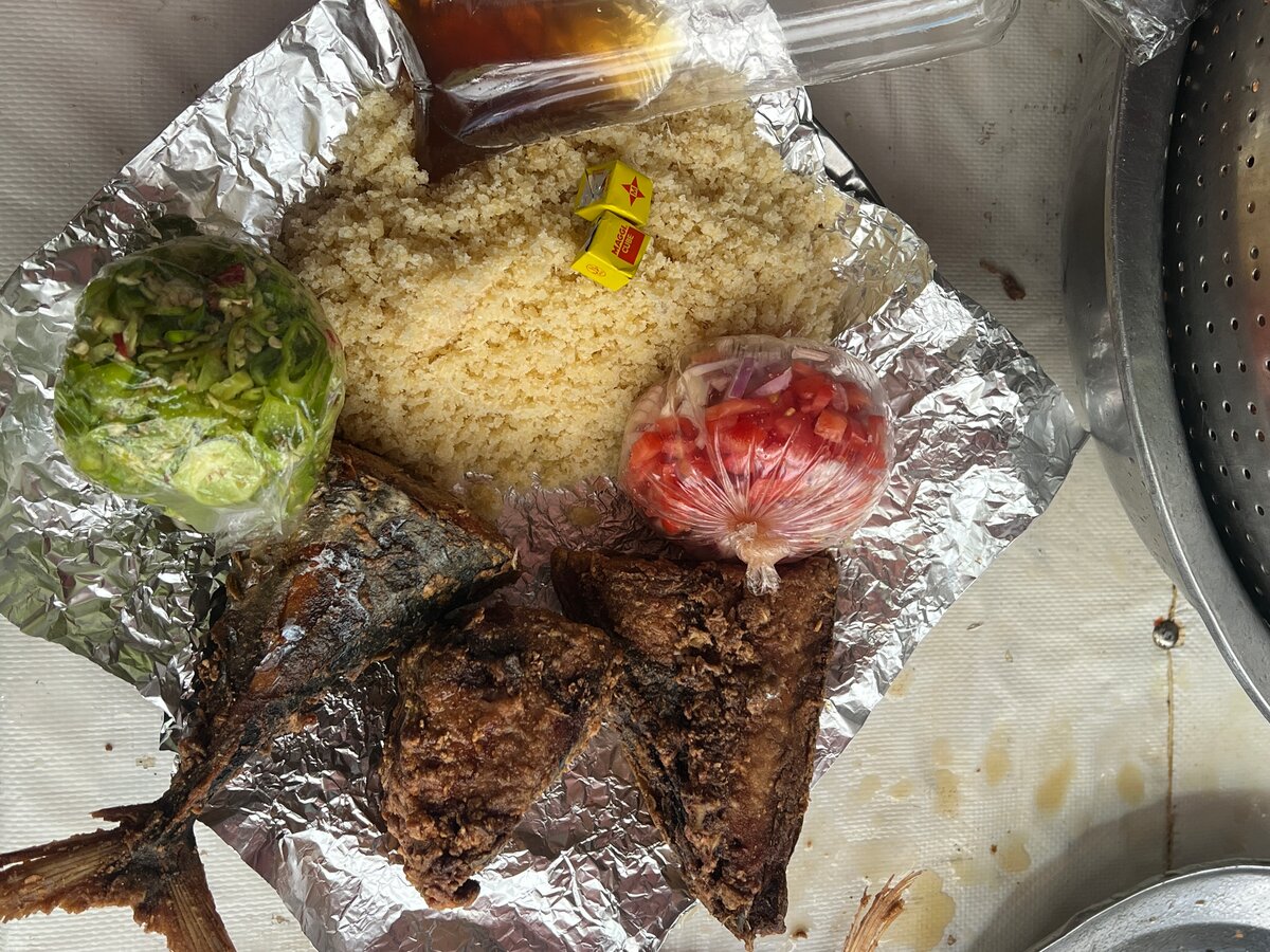 Savourez un délicieux repas de poisson frit épicé accompagné de couscous moelleux, parfait pour les amateurs de cuisine épicée. Ce plat est complété par des légumes frais et une sauce piquante qui rehausse chaque bouchée. Idéal pour un repas copieux et savoureux à la maison ou à emporter, ce mélange unique de saveurs africaines est une expérience culinaire à ne pas manquer. Parfait pour les déjeuners ou dîners en plein air!
