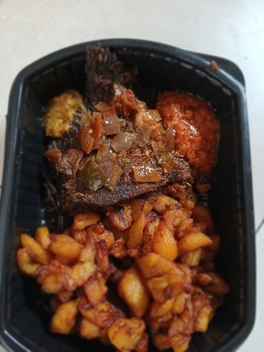 Savourez un délicieux plat de poisson frit accompagné de bananes plantains croustillantes et de sauce épicée. Ce repas idéal pour le déjeuner ou le dîner.