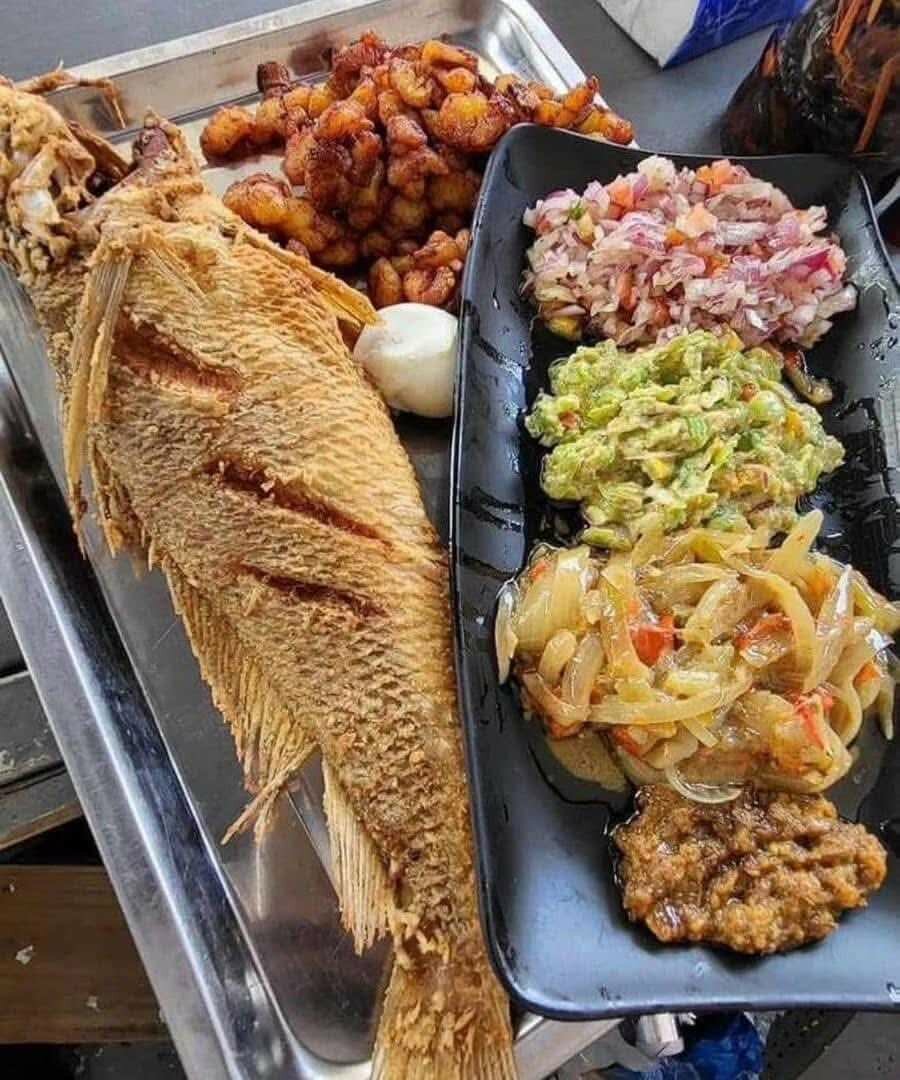 Savourez un délicieux poisson frit accompagné de sa garniture colorée et épicée. Parfait pour un repas convivial et riche en saveurs exotiques. Idéal pour les amateurs de cuisine unique et authentique.