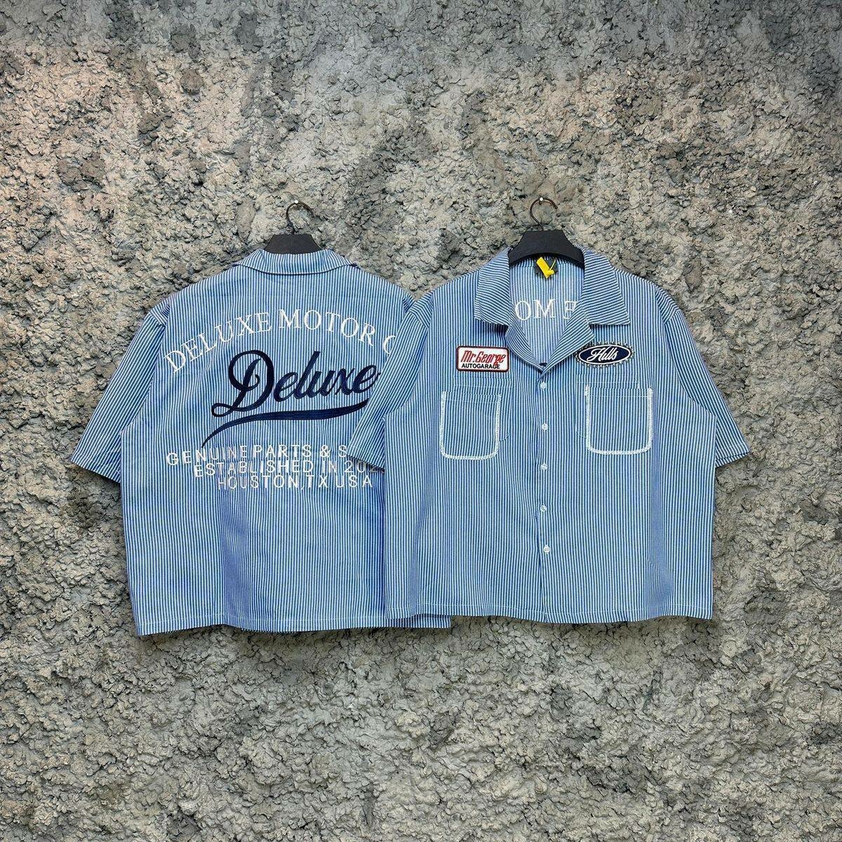 Vintage-inspired short-sleeve mechanic shirt with embroidered patches. Perfect blend of style and comfort, ideal for casual wear or garage work. Available in striped patterns with unique 'Deluxe Motor Co.' branding.