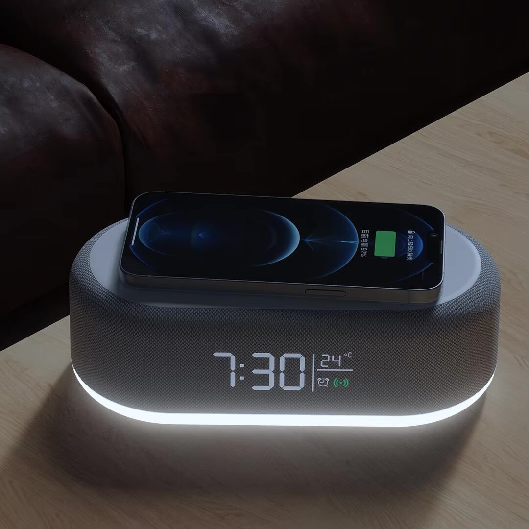 Réveil moderne avec affichage LED, fonction Bluetooth pour écouter de la musique, et chargeur sans fil intégré compatible avec iPhone, Samsung, Huawei et plus. Parfait pour un usage à la maison ou au bureau. Design élégant et épuré, idéal pour les amateurs de technologie et d'organisation.