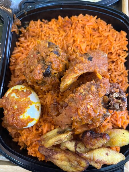 Découvrez un plat africain authentique avec du riz et haricots, spaghetti, viande épicée savoureuse et œuf dur. Idéal pour une expérience culinaire exotique et riche en saveurs. Parfait pour les déjeuners ou dîners.