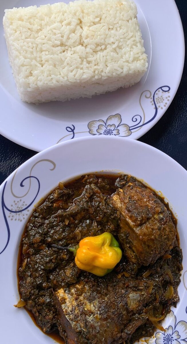 Du riz blanc bien cuit servi avec une sauce épinard