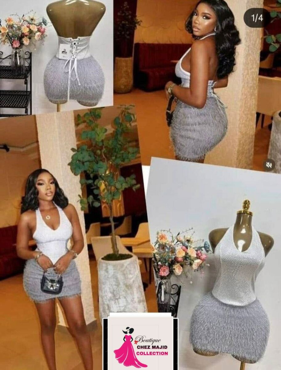 Découvrez cette robe à franges grise, parfaite pour une soirée chic. Sa coupe ajustée accentue les courbes, tandis que le haut blanc crée un contraste élégant. Idéale pour toutes vos sorties glamour.