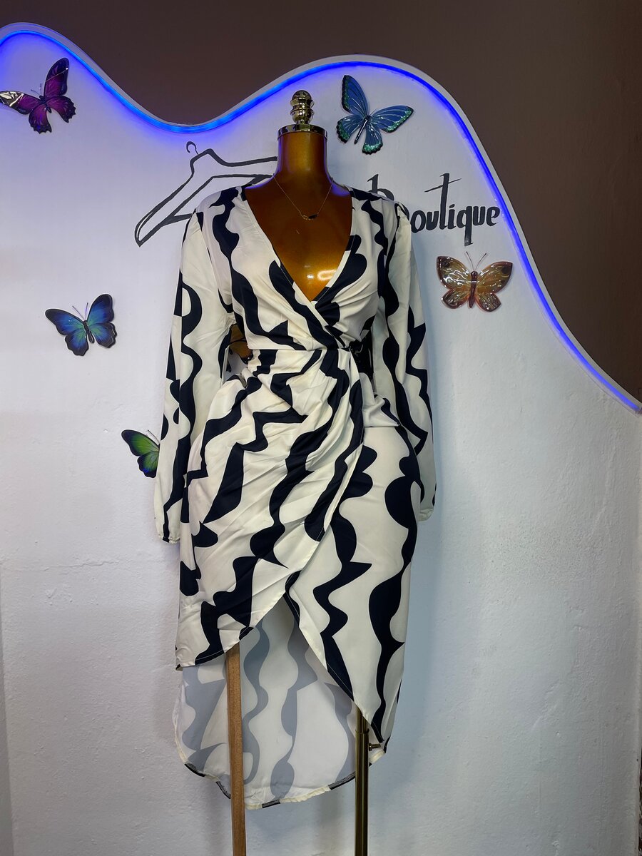 Cette robe à motifs noirs et blancs est idéale pour une soirée chic ou un événement spécial. Avec son design asymétrique et ses manches longues, elle offre à la fois confort et élégance. Parfaite pour mettre en valeur votre silhouette tout en restant tendance.