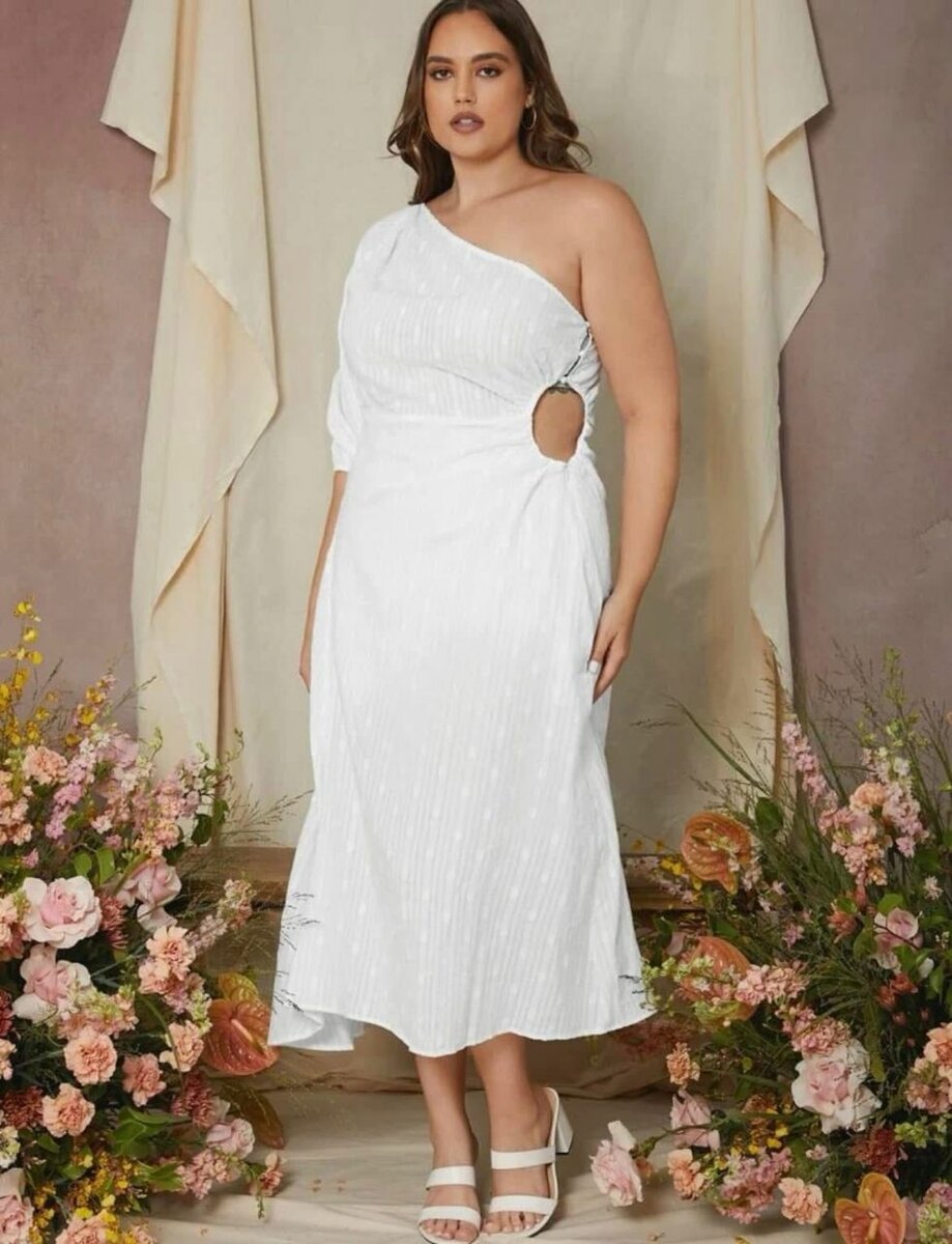 Cette robe asymétrique blanche est parfaite pour les occasions spéciales. Conçue avec un magnifique détail ajouré sur le côté, elle offre une silhouette flatteuse pour toutes les morphologies. Idéale pour les mariages, soirées et cérémonies, cette robe ajoute une touche de sophistication à votre garde-robe.