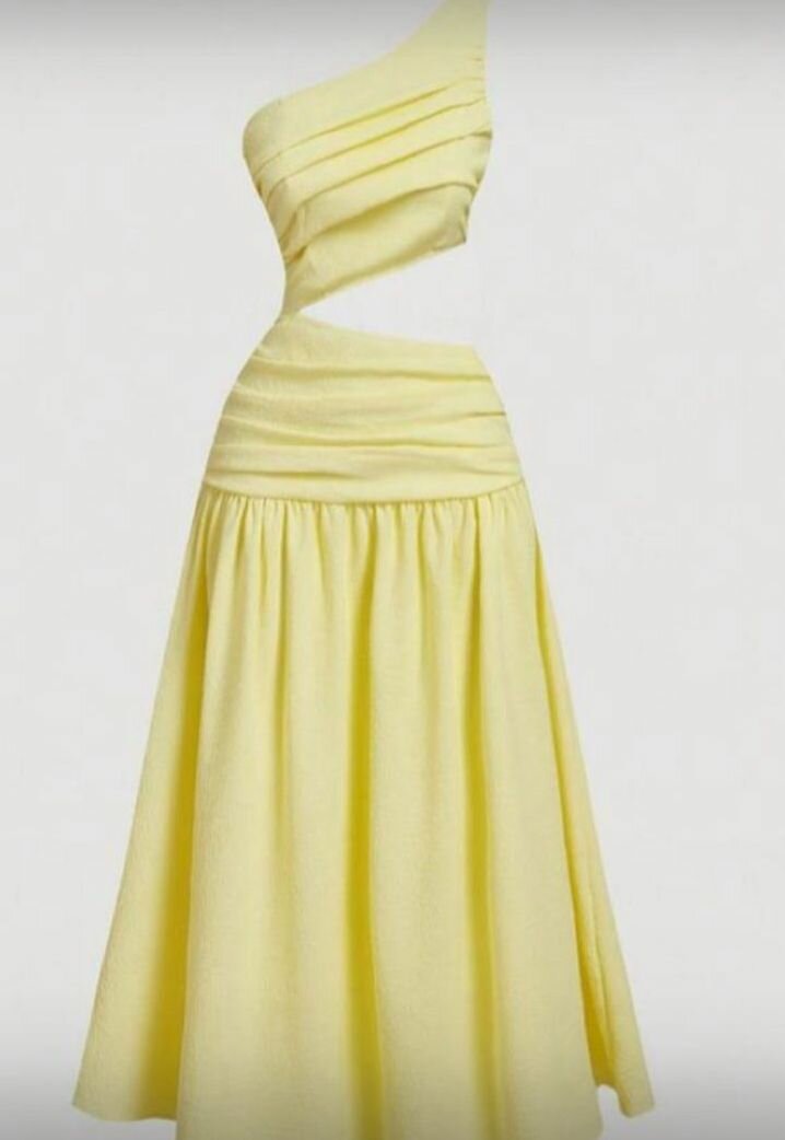 Élégante robe asymétrique jaune pour les soirées d'été. Design unique qui met en valeur la silhouette avec des découpes audacieuses. Tissu doux et fluide pour une sensation de confort. Idéale pour une soirée estivale ou une occasion spéciale, elle se démarque par son allure moderne et séduisante.