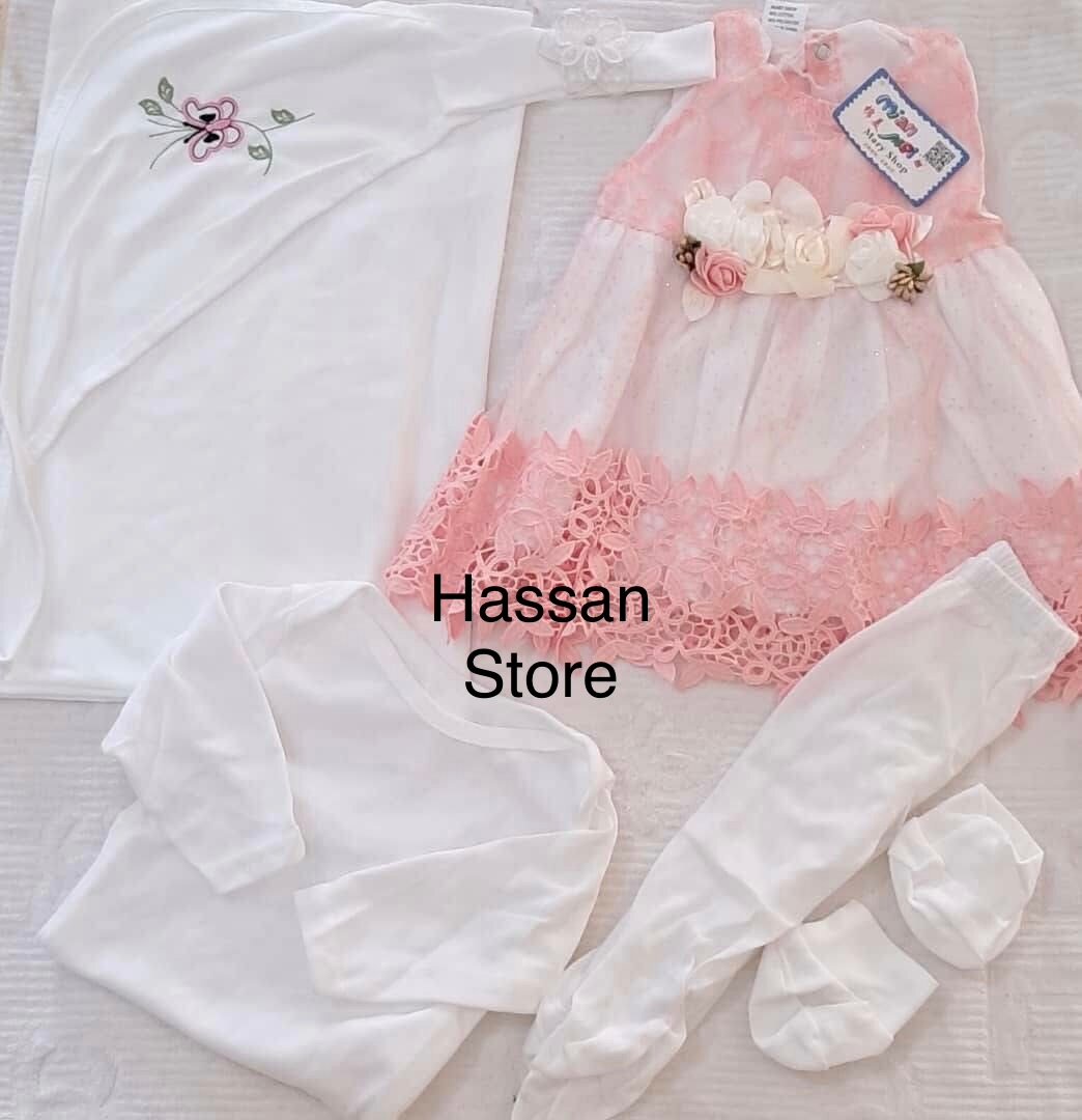 Élégante robe bébé en dentelle rose avec des fleurs appliquées, parfaite pour les cérémonies et occasions spéciales. Confortable et douce, cette tenue est accompagnée d'un ensemble de hauts et bas blancs, idéal pour le confort quotidien de votre enfant.