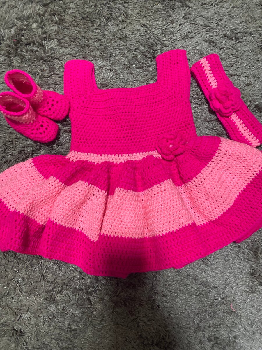 Cette adorable robe en tricot rose avec des rayures est idéale pour les petites princesses. Fabriquée à la main, elle est douce et confortable, parfaite pour des occasions spéciales ou un usage quotidien. Comprend une paire de chaussons assortis et un bandeau décoratif. Un superbe choix pour garder votre enfant stylé et chaleureux.