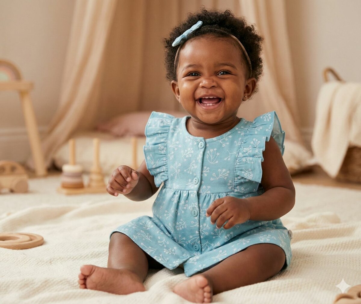 Adorable robe bébé en coton bleu avec motifs floraux, idéale pour les beaux jours. Disponible en 5 tailles (1-18 mois). Parfaite pour apporter une touche de fraîcheur et de style à la garde-robe de votre enfant. Douce et confortable pour jouer toute la journée.