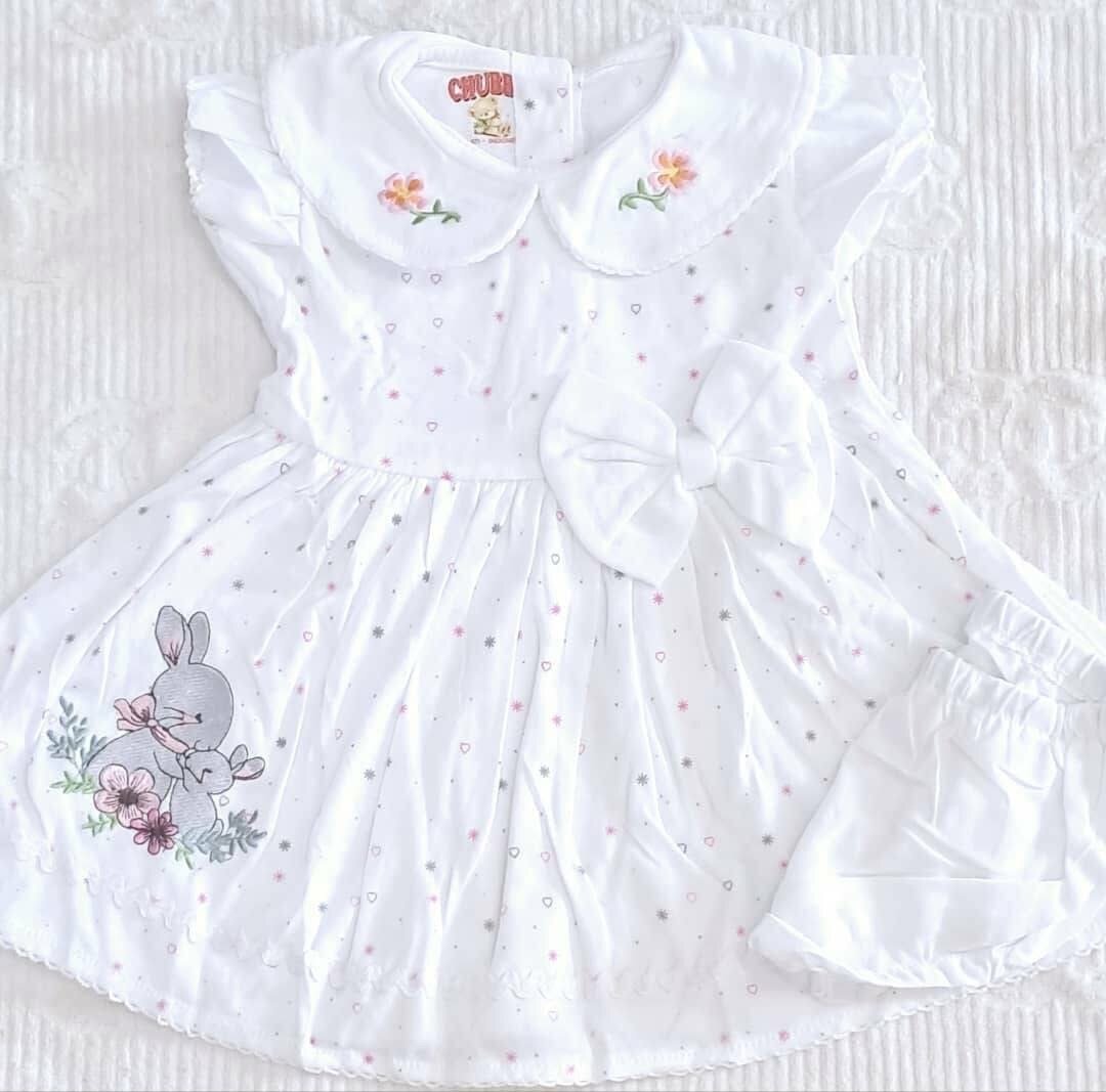 Adorable robe blanche pour bébé fille, ornée d'un motif de lapin et de fleurs. Confection douce et légère. Idéale pour les occasions spéciales ou une journée estivale.