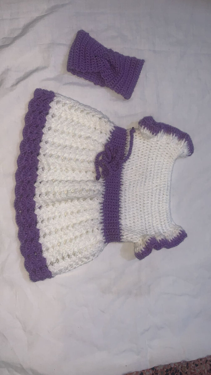Adorable robe tricotée à la main pour bébé avec bandeau assorti. Parfaite pour les occasions spéciales