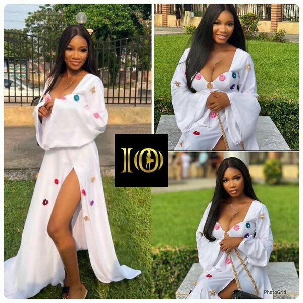 Robe blanche longue à manches larges décorées de perles colorées, matière fluide et légère. Élégante et originale. Neuf.