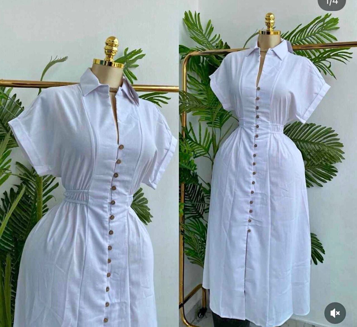 Élégante et confortable, cette robe blanche à boutons est parfaite pour les occasions décontractées ou semi-formelles. Confectionnée dans un tissu léger, elle offre une silhouette féminine avec sa taille resserrée.