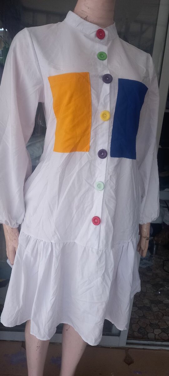 Égayez votre garde-robe avec cette robe blanche ornée de boutons et de poches colorés. Idéale pour un look décontracté et chic, elle s'adapte à toutes les occasions.