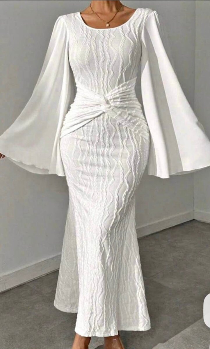Cette robe blanche élégante est idéale pour toutes les occasions spéciales. Avec ses manches longues fluides et sa silhouette flatteuse, elle vous offre un look à la fois moderne et raffiné. Parfaite pour un mariage, une soirée ou un événement formel, cette robe vous garantit d'être au centre de l'attention.