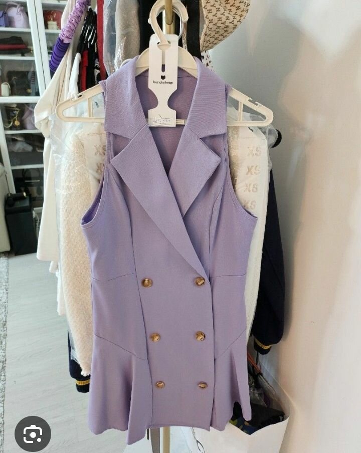 Cette robe blazer sans manches combine l'élégance classique avec une touche moderne. Idéale pour les soirées ou les événements professionnels, elle offre une coupe ajustée flatteuse. Le tissu violet doux et les boutons dorés ajoutent du chic à votre tenue. Parfaite pour affirmer votre style avec confiance et sophistication.
