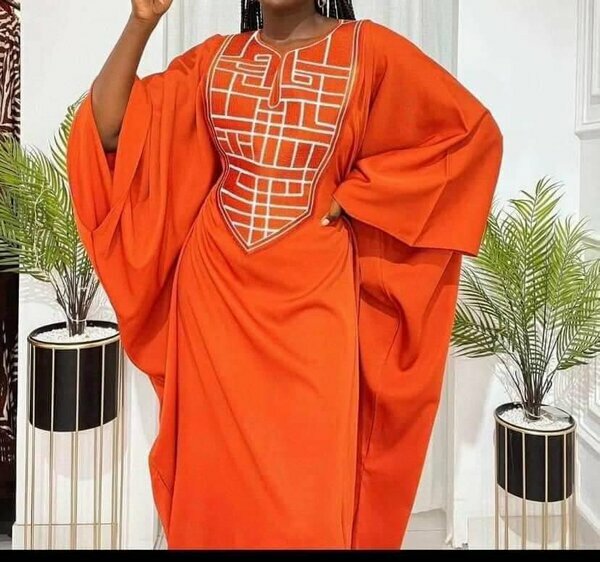 Robe boubou orange femme, broderie graphique contemporaine, coupe ample et chic. Idéale pour événements, sorties et looks modernes. Originalité garantie !