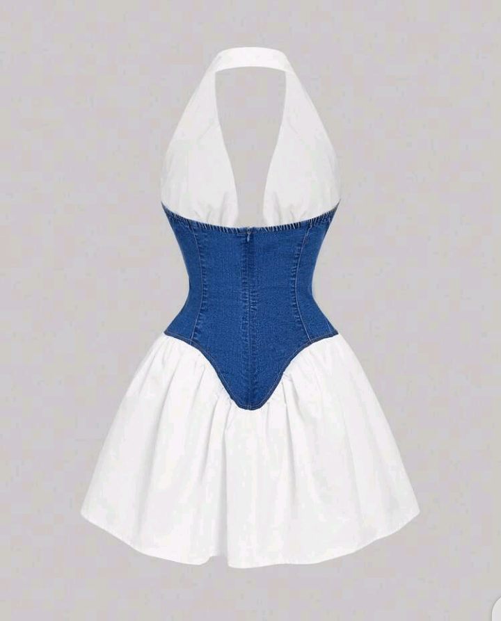 Découvrez cette robe corset élégante, parfaite pour une soirée chic ou une journée d'été. Avec un haut en denim bleu et une jupe blanche légère, elle combine style et confort. Son design flatteur souligne la silhouette, tandis que le dos ouvert ajoute une touche sexy. Idéale pour toutes les occasions où vous voulez impressionner.