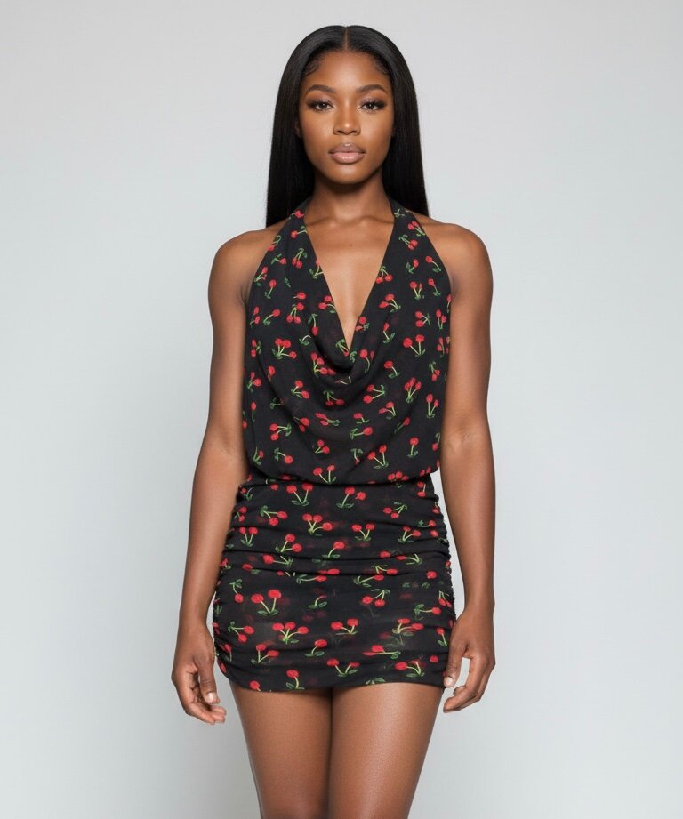 Ajoutez une touche fruitée à votre garde-robe avec cette robe courte à motif cerises. Parfaite pour une soirée d'été, elle combine style et confort grâce à sa coupe flatteuse et son tissu léger. Idéale pour les femmes à la recherche d'une tenue décontractée mais chic. Portez-la avec des talons ou des sandales pour compléter le look et vous démarquer en toute occasion.