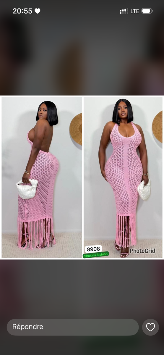 Robe en crochet rose, idéale pour les soirées estivales. Avec des détails à franges et une coupe flatteuse, elle garantit un look chic et unique. Parfaite pour se démarquer avec style.