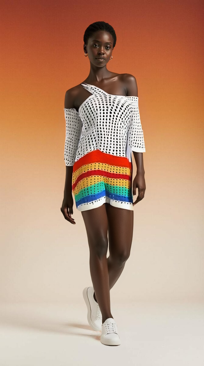Cette robe d'été légère et colorée est idéale pour un look décontracté et élégant. Fabriquée avec un tissu respirant, elle offre un confort optimal pendant les journées chaudes. Les motifs arc-en-ciel ajoutent une touche joyeuse et moderne, parfaite pour toutes les occasions estivales. Associez-la avec des baskets blanches pour un style frais et tendance.