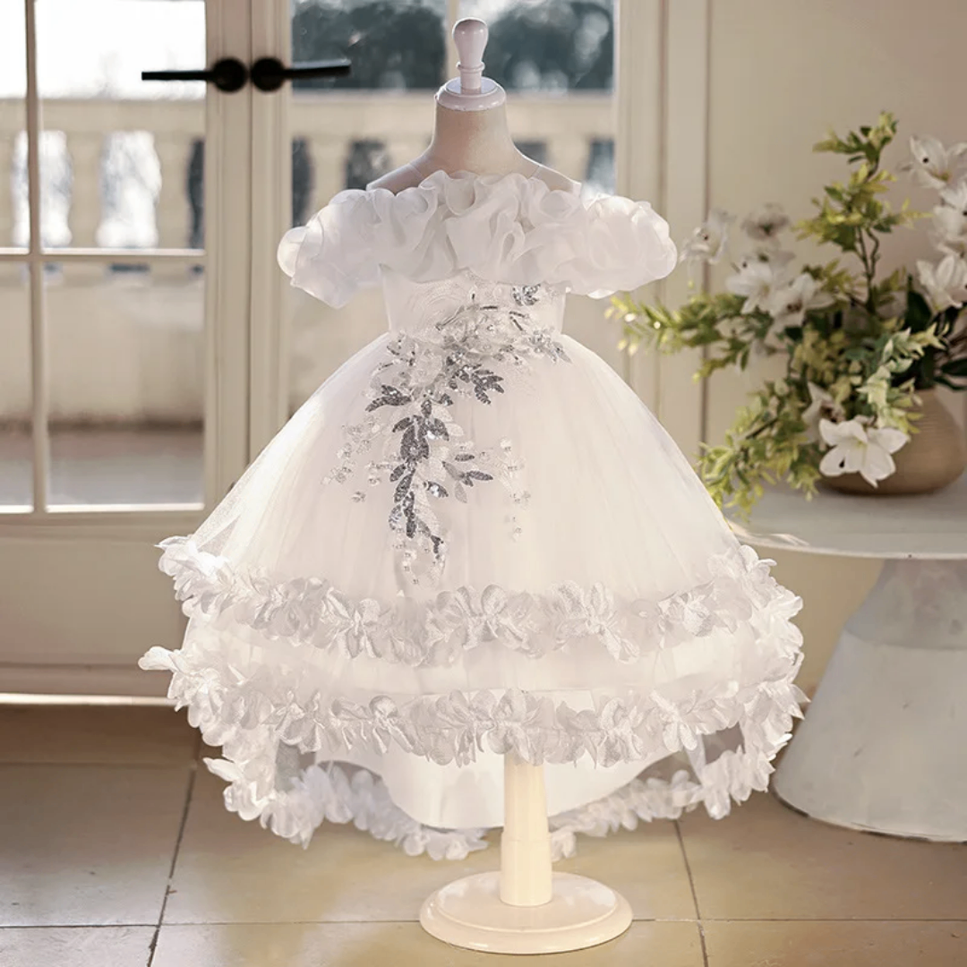 Élégante robe de cérémonie pour enfants, ornée de fleurs et de dentelle luxueuse. Conçue pour des occasions spéciales, elle assure un look charmant et raffiné. Idéale pour mariages et fêtes.