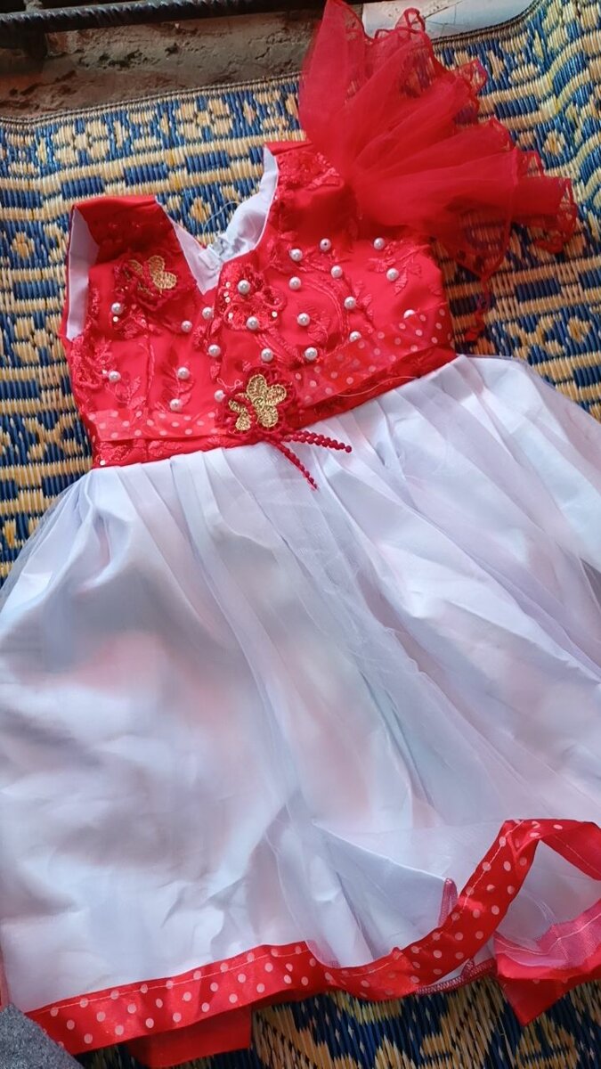 Charmante robe de fête pour enfant avec corsage rouge orné de fleurs et perles. Jupe fluide en tulle blanc avec rubans rouges. Parfaite pour occasions spéciales et événements festifs. Offrez élégance et confort à votre petite princesse.