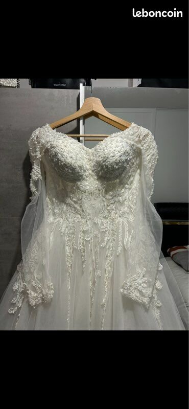 Sublime robe de mariée avec dentelle délicate et perles étincelantes. Conçue pour un confort optimal lors de votre jour spécial, elle apporte une touche de glamour et d'élégance. Parfaite pour une cérémonie inoubliable, cette robe met en valeur la silhouette féminine tout en offrant une allure royale.