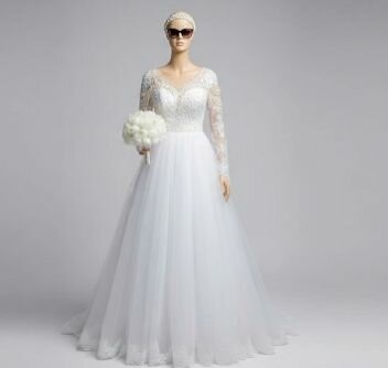 Sublime robe de mariée en dentelle avec manches longues et jupe évasée. Parfaite pour un mariage de rêve. Ajoutez une touche d'élégance et de sophistication à votre grand jour avec cette magnifique création. Convient à toutes les saisons et assure un confort optimal.