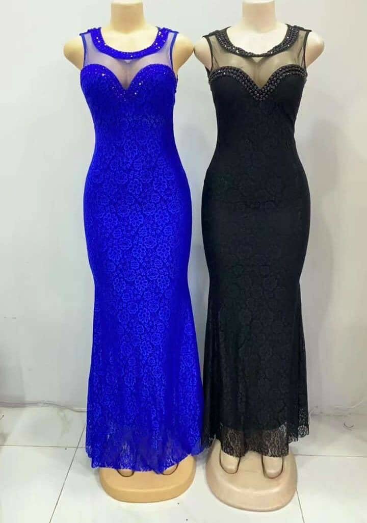 Robe longue en dentelle avec détails en tulle, parfait pour les occasions spéciales. Design élégant et sophistiqué, disponible en bleu royal et noir. Idéale pour les soirées et mariages.
