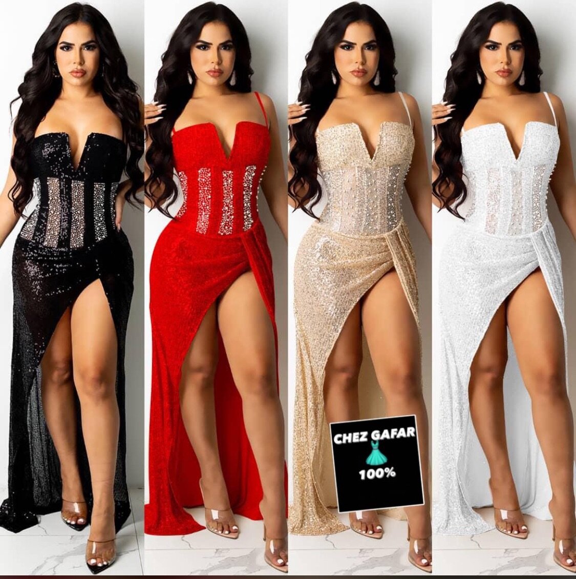 Éblouissante robe de soirée avec corset scintillant et fente audacieuse. Parfaite pour les soirées élégantes, disponible en plusieurs couleurs glamour.