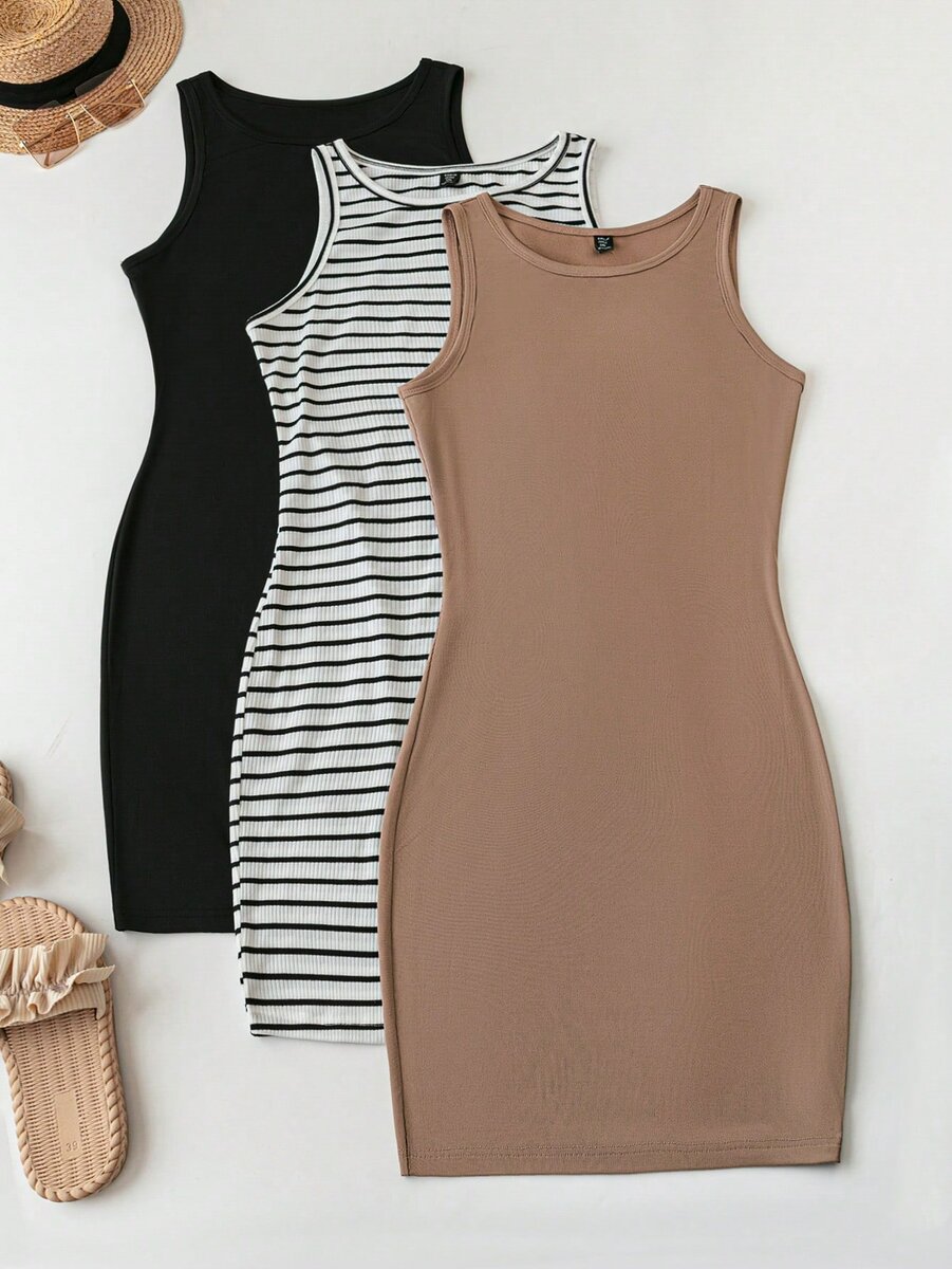 Découvrez notre robe débardeur élégante en trois styles: noir uni, rayures classiques et nude sophistiqué. Parfait pour un look décontracté ou chic. Matériau confortable et stretch. Idéal pour l'été ou à superposer.
