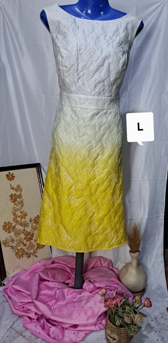Élégante robe sans manches avec dégradé blanc vers jaune. Tissu léger, idéal pour sorties estivales ou occasions spéciales. Confortable et chic, taille L.