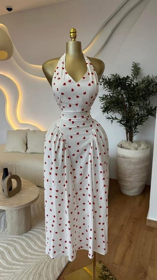 Élégante robe d'été avec motif de cœurs rouges. Conçue pour allier confort et style, idéale pour les sorties estivales. Tissu léger offrant une coupe flatteuse pour toutes les morphologies. Parfaite pour des occasions décontractées ou des rendez-vous romantiques.