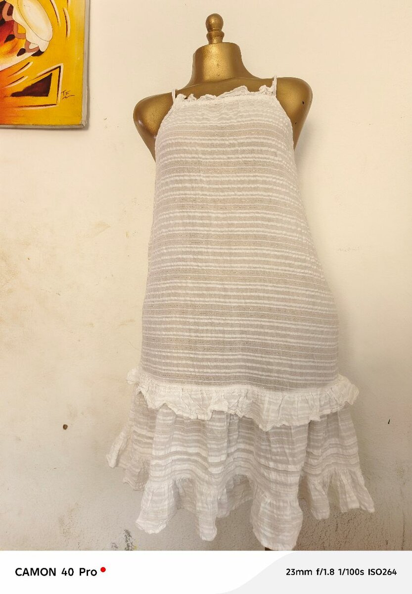 Découvrez cette magnifique robe d'été blanche subtilement rayée, parfaite pour les journées chaudes. Avec ses volants élégants et sa coupe fluide, elle offre à la fois confort et style. Idéale pour une promenade à la plage ou un déjeuner en terrasse.