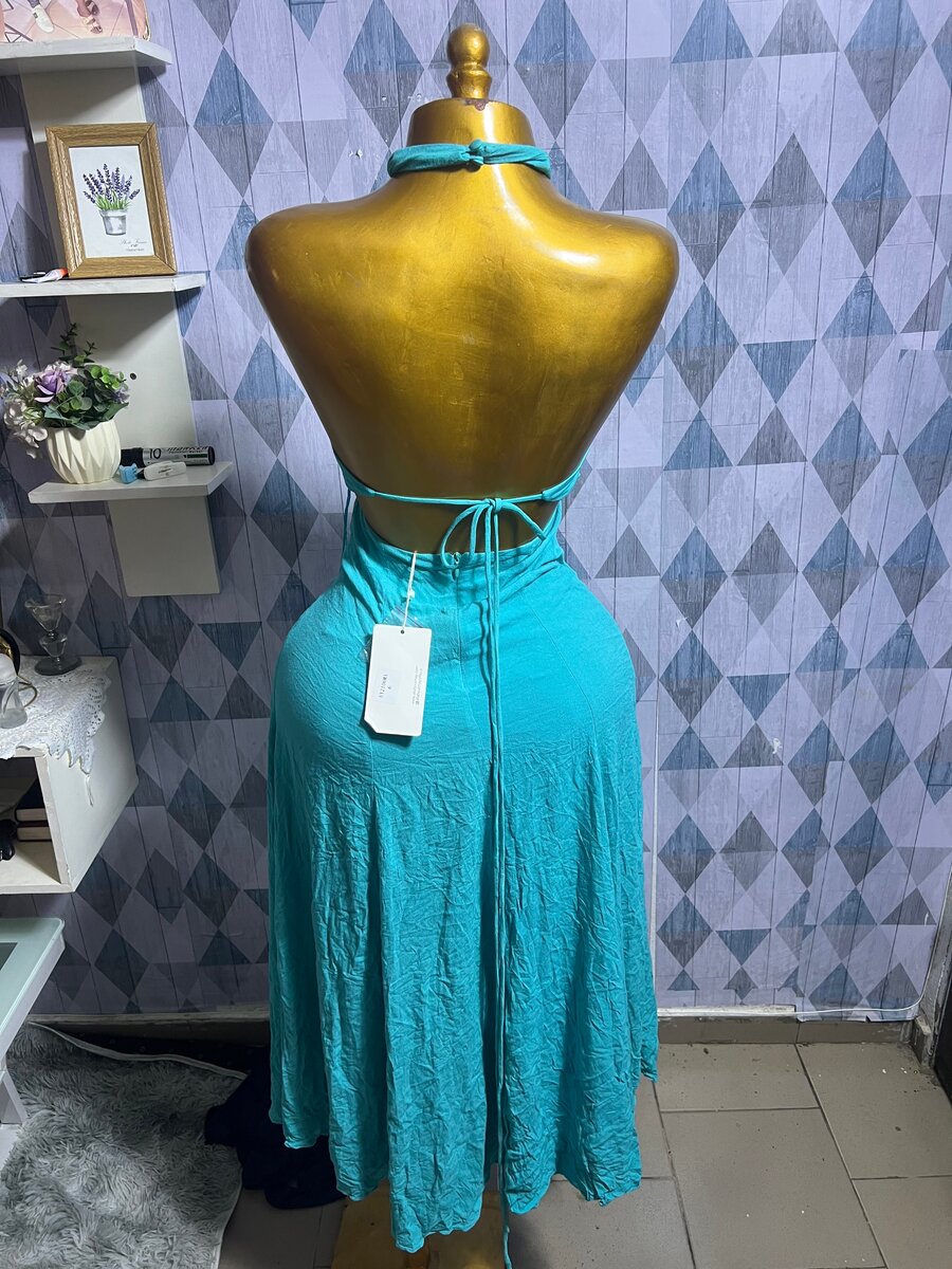 Élégante robe d'été turquoise en tissu léger et respirant. Parfaite pour des occasions décontractées, cette robe dos nu offre un confort optimal tout en mettant en valeur votre silhouette. Idéale pour les journées chaudes et les soirées estivales.