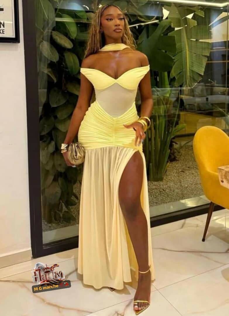 Sublimez votre soirée avec cette robe longue échancrée, parfaite pour les événements glamour. Conçue avec des détails raffinés, elle épouse élégamment votre silhouette. Idéale pour un look chic et moderne, elle garantit une allure inoubliable. Faites sensation à chaque occasion!