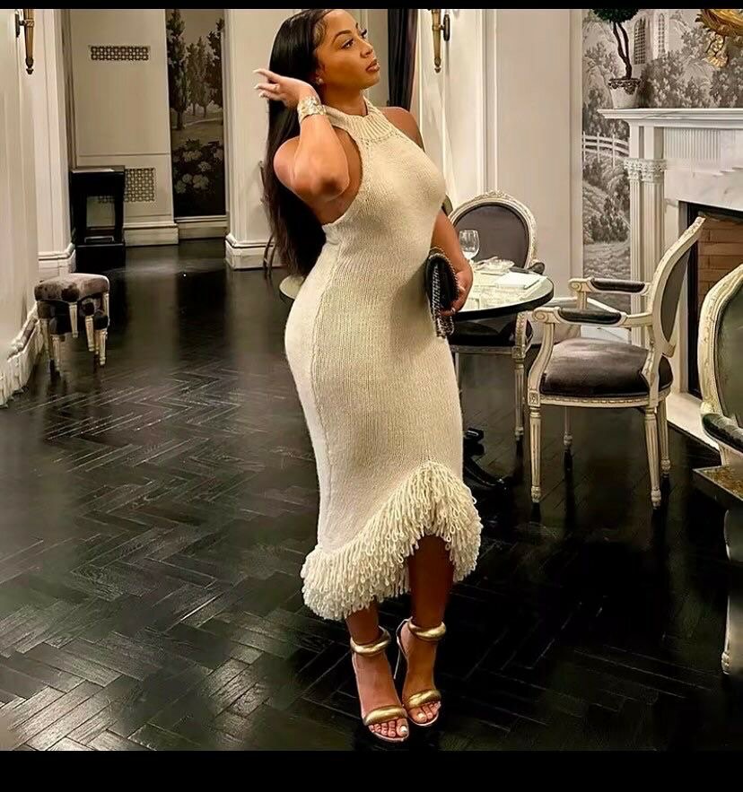 Découvrez cette robe élégante à franges, parfaite pour une soirée chic ou un événement spécial. Son design sans manches et sa coupe flatteuse mettent en valeur la silhouette. Fabriquée avec des matériaux de haute qualité, elle assure confort et style. Idéale pour être au centre de l'attention lors de vos sorties.