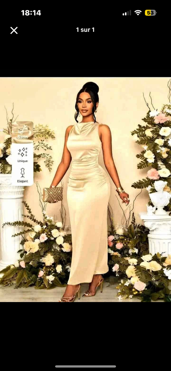 Éblouissez lors de votre prochaine occasion spéciale avec cette somptueuse robe de soirée dorée. Conçue pour flatter et élégamment draper la silhouette, elle est idéale pour les galas, réceptions ou soirées. Sa texture satinée reflète magnifiquement la lumière pour un effet glamour assuré. Parfaite pour celles qui cherchent à combiner sophistication et style moderne.