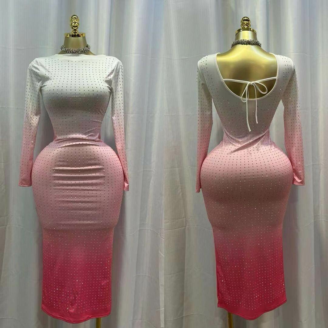 Optez pour cette robe dégradée blanc et rose avec détail brillant, idéale pour une soirée chic. Matière confortable et design séduisant avec dos ouvert.
