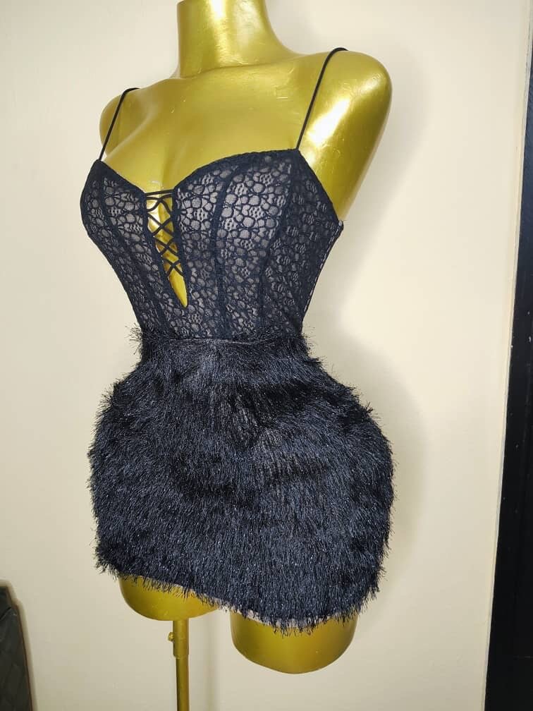 Découvrez cette robe élégante en dentelle noire avec détails en fourrure. Parfaite pour une soirée spéciale, elle combine confort et style. Un choix idéal pour se démarquer.