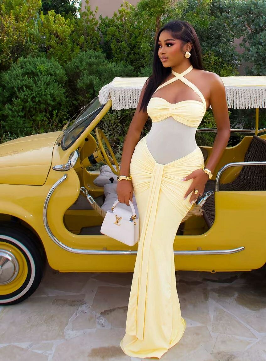 Succombez à l'élégance de cette robe longue jaune, parfaite pour les soirées d'été. Son design croisé met en valeur vos formes, tandis que son tissu léger assure un confort optimal. Idéale pour une allure glamour lors de vos événements spéciaux.